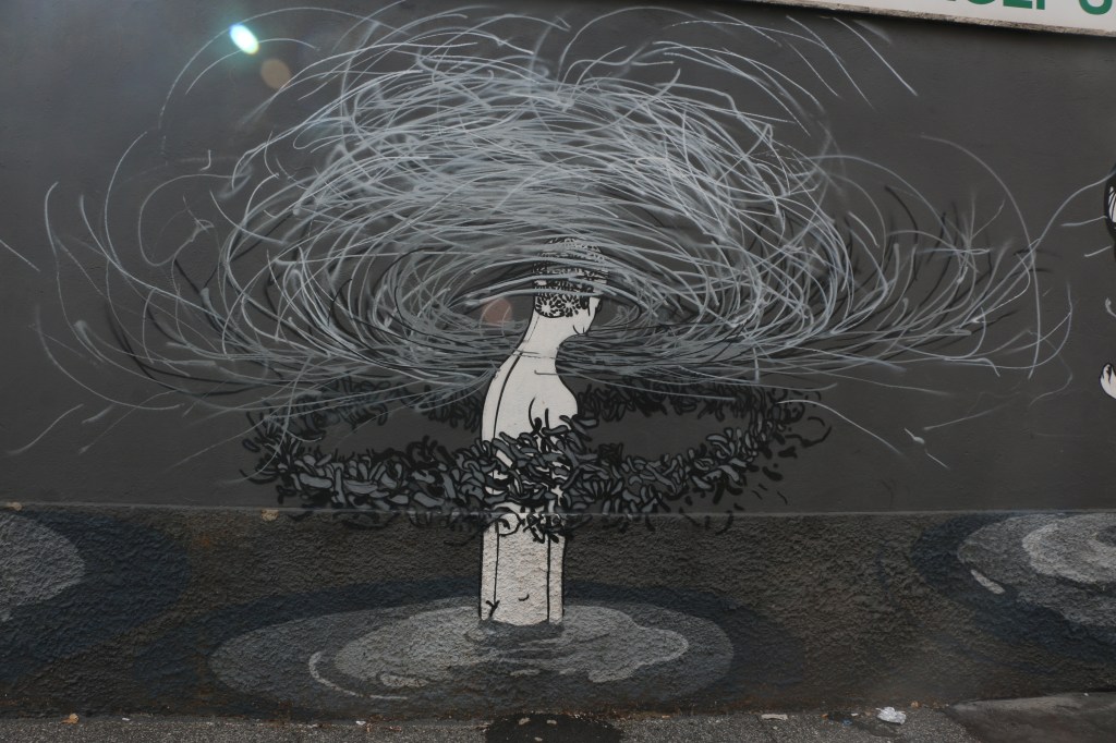 De pronto encontré ese mural. Una pared negra- gris, con mujeres que emergían del fango; sus cabelleras largas eran formas espesas y con volumen… ¿reflexionaban? Me gustaron y decidí tomarles muchas fotos e intentar descifrar un mensaje.