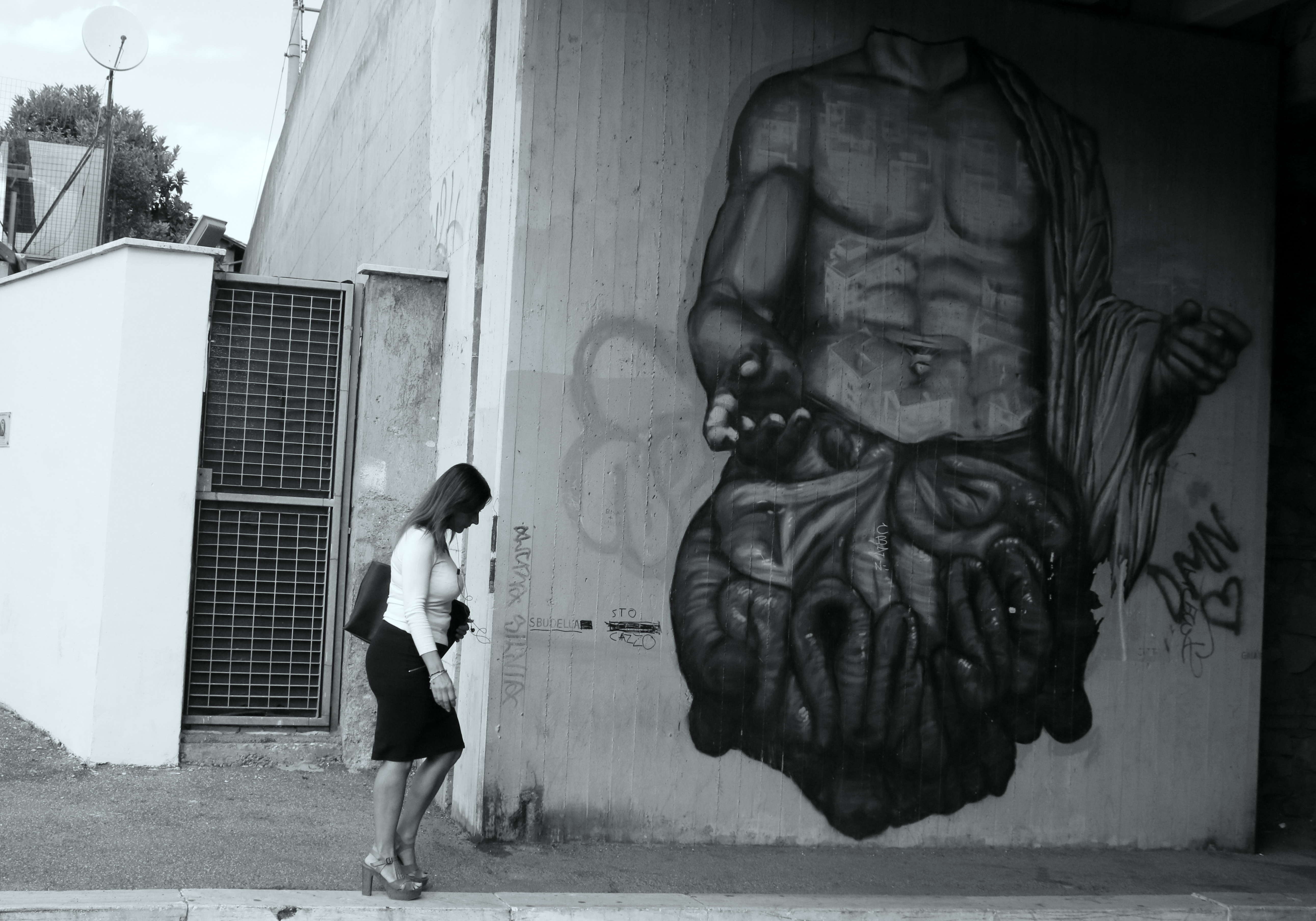 Fotografié todo con el mayor detalle posible, sin embargo, cuando encontré ese mural sentí infinitas ganas de contemplarlo. De una pared pintada en tonos grises emergían del fango dos parejas, ellas levitaban, ellos seguían atrapados hasta la cintura sin poder brotar. El cabello (¿o eran pensamientos?) de ellas se había transformado en formas abultadas y redondeadas, que cubrían sus caras y cabezas, mientras se elevaban hacia el cielo a cuentagotas. Ellas la Venus de Milo, ellos figuras del Jardín de las Delicias.